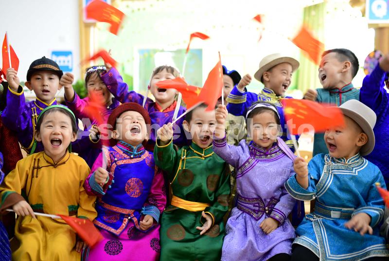 2020年9月21日,呼和浩特市蒙古族幼儿园内,小朋友们参加“歌唱祖国”活动。