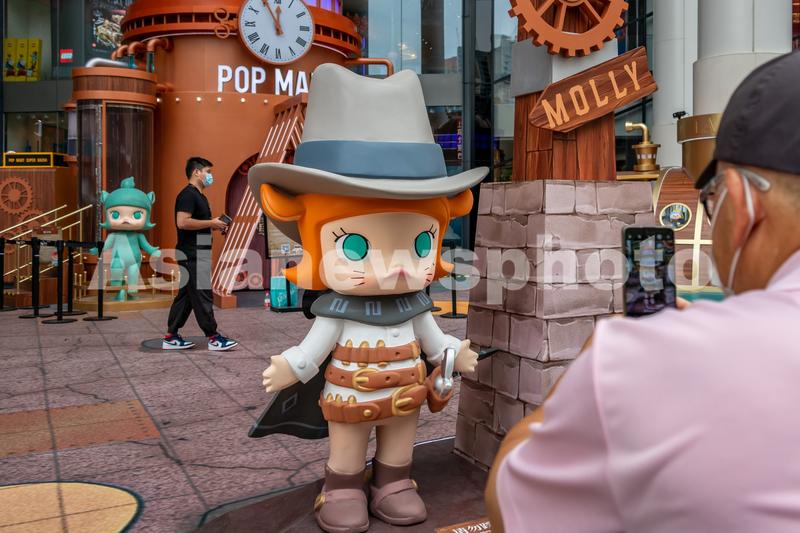 2020年9月21日,上海,游客在南京路步行街世茂广场的泡泡玛特“潮酷冒险岛”主题展览上拍照。