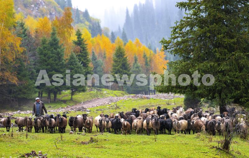 2020年9月18日,新疆昭苏县,位于天山深处的多浪沟哈萨克族牧民赶着牛羊在转场途中。金秋九月,新疆伊犁河谷上的昭苏大草原迎来了秋季转场,当地牧民将70余万头牲畜从夏牧场转往秋牧场。