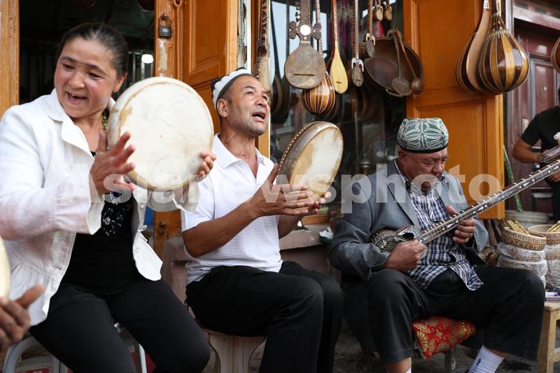 9月22日,新疆莎车县老城区喀赞其街,几名居民现场演奏传统乐器。