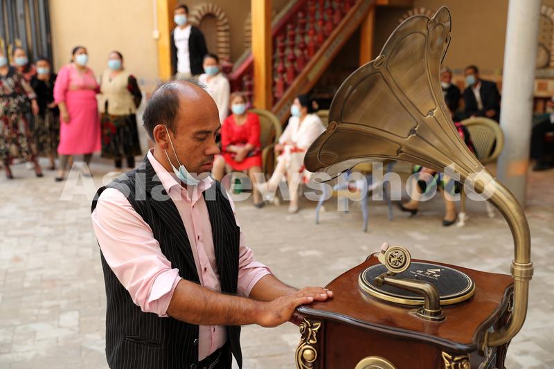 9月22日,新疆莎车县老城区喀赞其街,一名居民在调试唱片机。