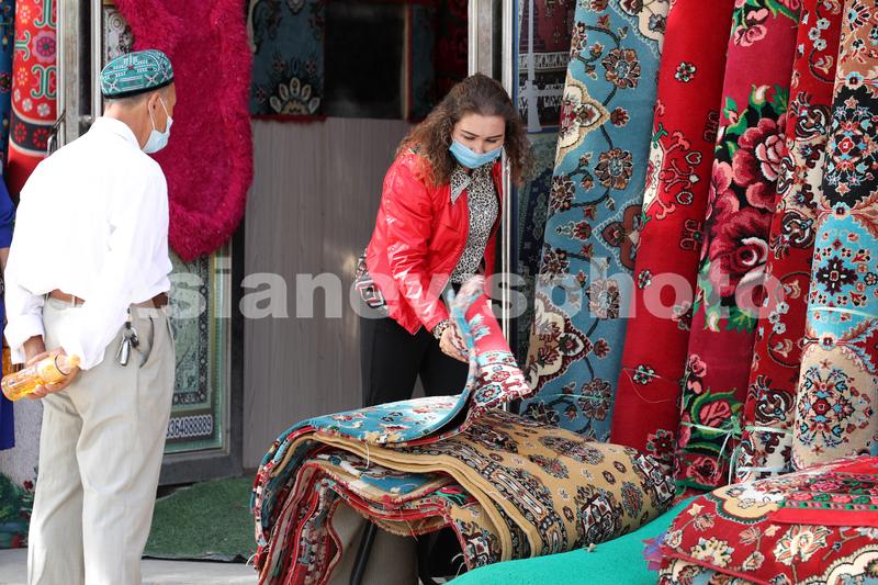 9月22日,新疆莎车县老城区喀赞其街,顾客挑选毛毯。