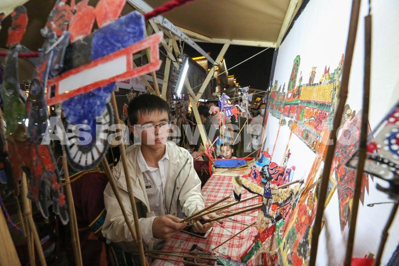 图片说明:9月24日,湖北襄阳古城内举办非遗文创市集,非遗传承人展示皮影技艺。