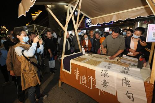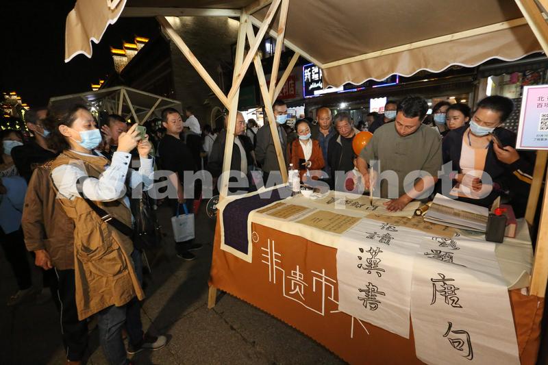 图片说明:9月24日,湖北襄阳古城内举办非遗文创市集,非遗传承人展示书法。