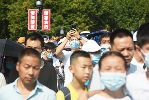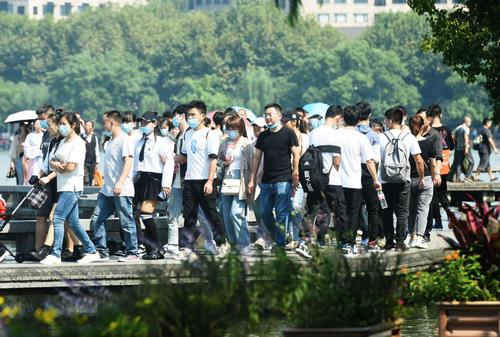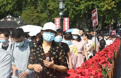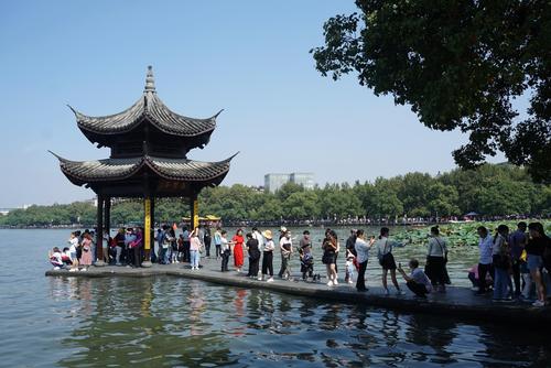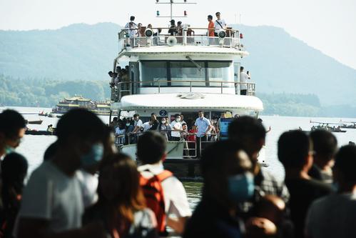 图片说明:2020年10月2日,杭州西湖集贤亭上游客人头攒动。