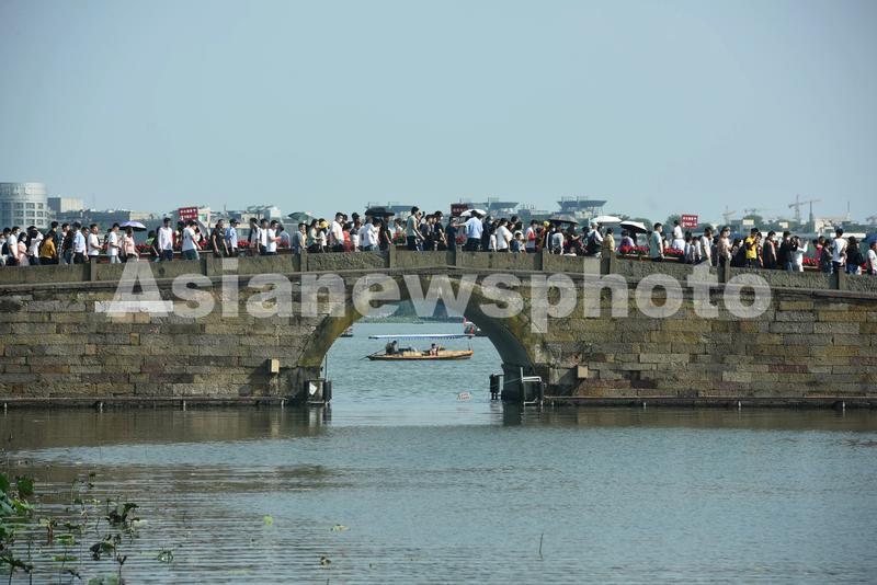 图片说明:2020年10月2日,杭州西湖断桥上游客人头攒动。