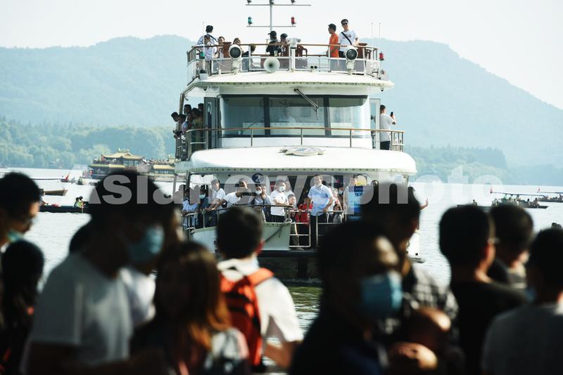 图片说明:2020年10月2日,大批游客在杭州西湖边等待乘坐游船。