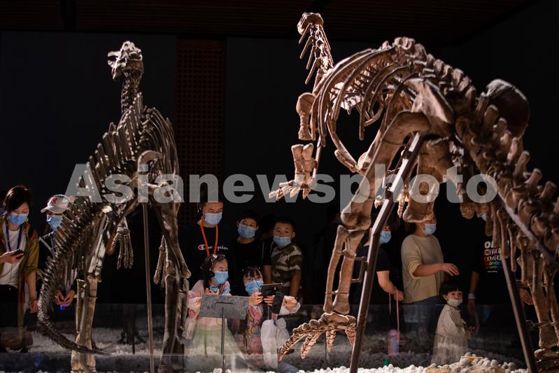 10月3日,参观者在南京博物院观看展出的恐龙化石。