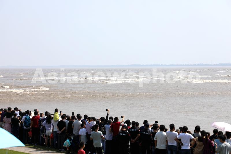 图片说明:2020年10月1日,正值中秋国庆假期,在浙江海宁盐官观潮胜地,钱塘江大潮汹涌而来,吸引众多游客观赏。