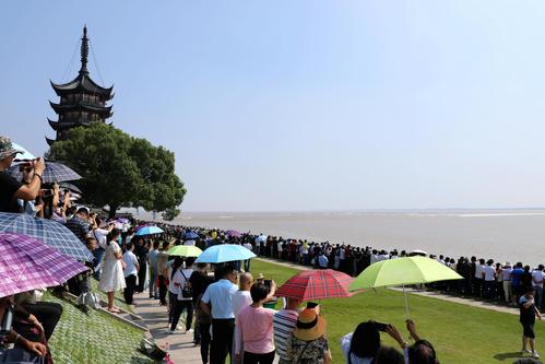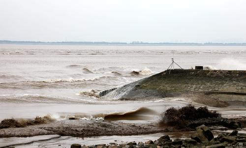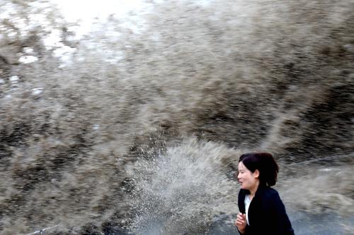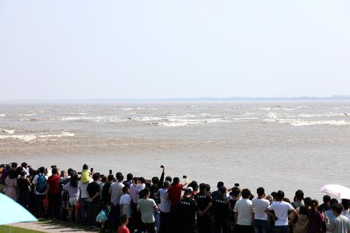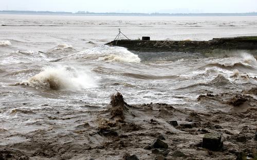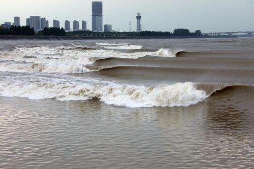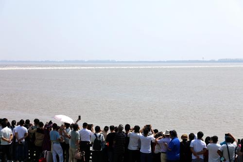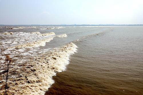 图片说明:2020年10月1日,在浙江海宁盐官观潮胜地,钱塘江大潮汹涌而来。