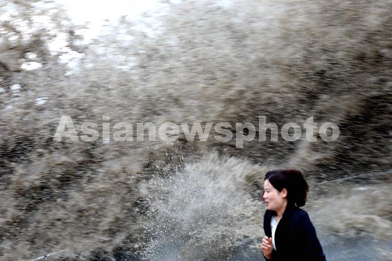 图片说明:2020年10月7日,浙江杭州,钱塘江江干七格观潮段,大潮奔涌而来激起巨浪冲上堤坝,观潮游客迅速躲避。