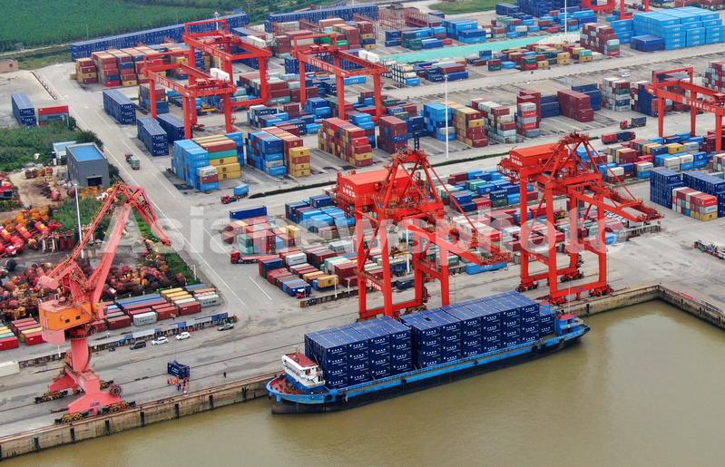 图片说明:2020年10月4日,满载集装箱的轮船停靠在如皋港集装箱码头。
