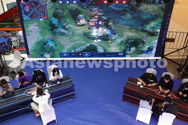 图片说明:2020年10月8日,在山东烟台大悦城,选手参加“王者荣耀线下赛”。