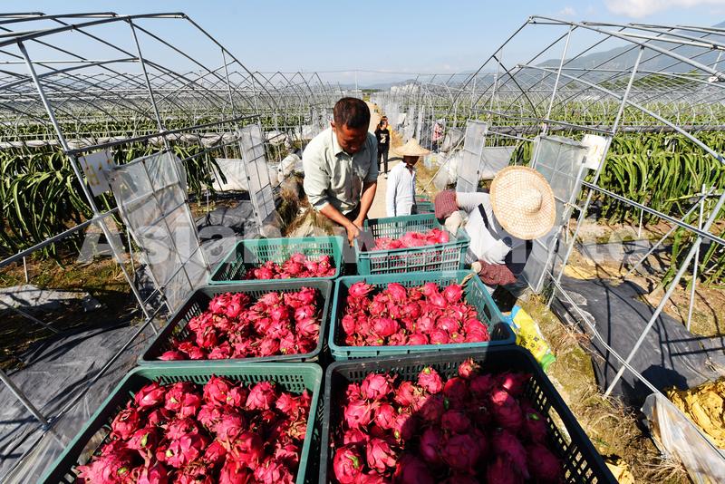 图片说明:2020年10月10日,在浙江省台州市仙居县台湾农民创业园,果农在采收红心火龙果。