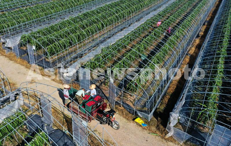 图片说明:2020年10月10日,在浙江省台州市仙居县台湾农民创业园,果农在采收红心火龙果。