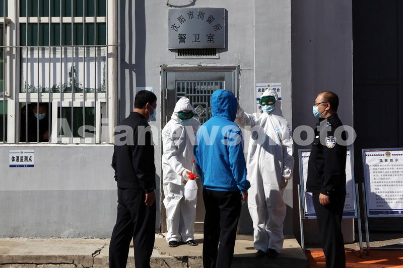 2020年10月13日,沈阳市拘留所民警对入所人员进行体温测量和消毒。