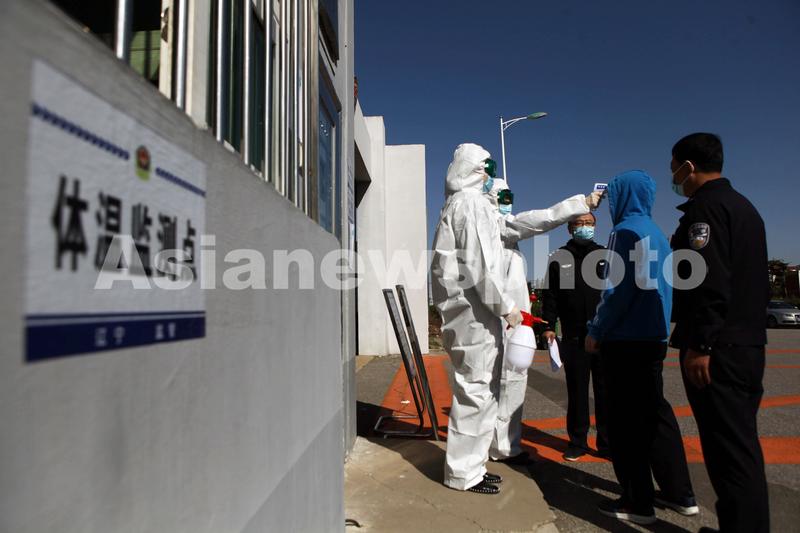 2020年10月13日,沈阳市拘留所民警对入所人员进行体温测量。