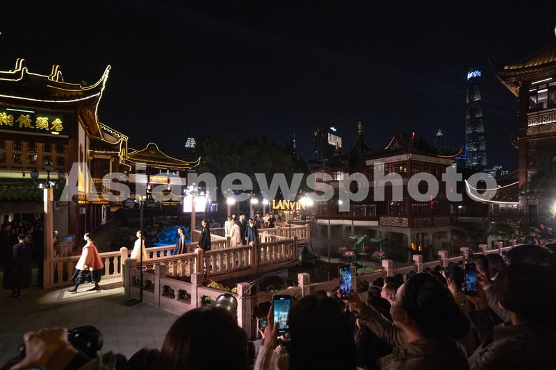 图片说明:10月17日晚,LANVIN 2021春夏时装秀在上海豫园九曲桥上举行。