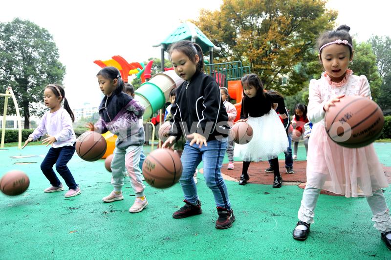 图片说明:10月16日,连云港核电钟声国际幼儿园的孩子在进行体育项目运动。