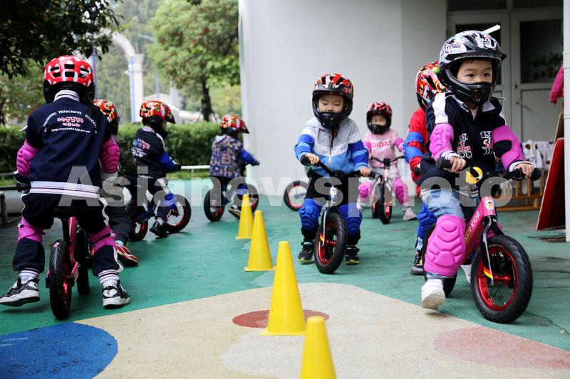 图片说明:10月16日,连云港核电钟声国际幼儿园的孩子在进行体育项目运动。