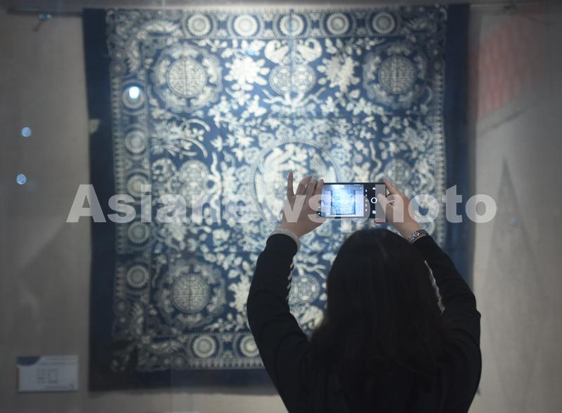2020年10月22日,参观者在浙江纺织服装职业技术学院观看蓝印花布精美纹样。
