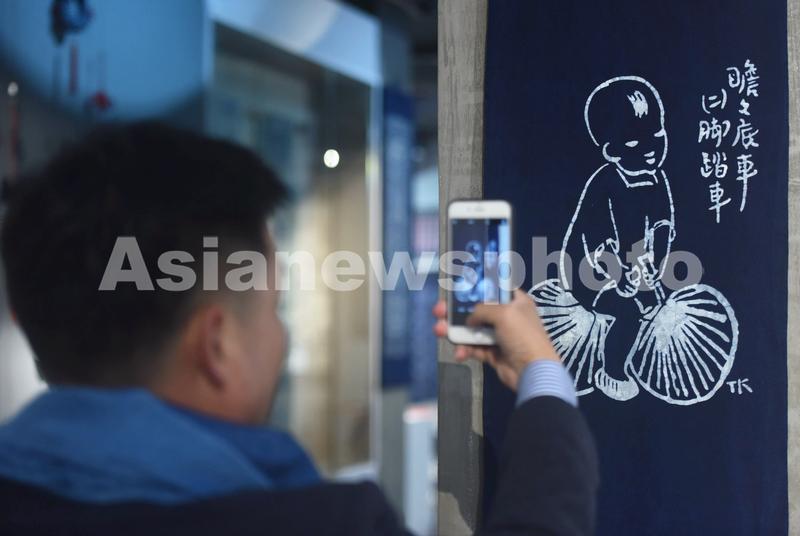 2020年10月22日,参观者在浙江纺织服装职业技术学院观看用蓝印花布技术制作而成的丰子恺先生画作。