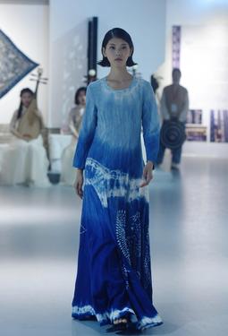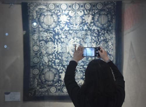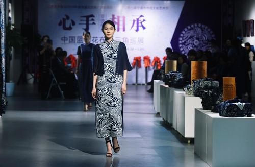 当日,“心手相承——中国蓝印花布长三角巡展”首展亮相位于宁波的浙江纺织服装职业技术学院,来自浙江纺院学生在巡展上对蓝印花布时装表演更是吸引不少参观者的目光。