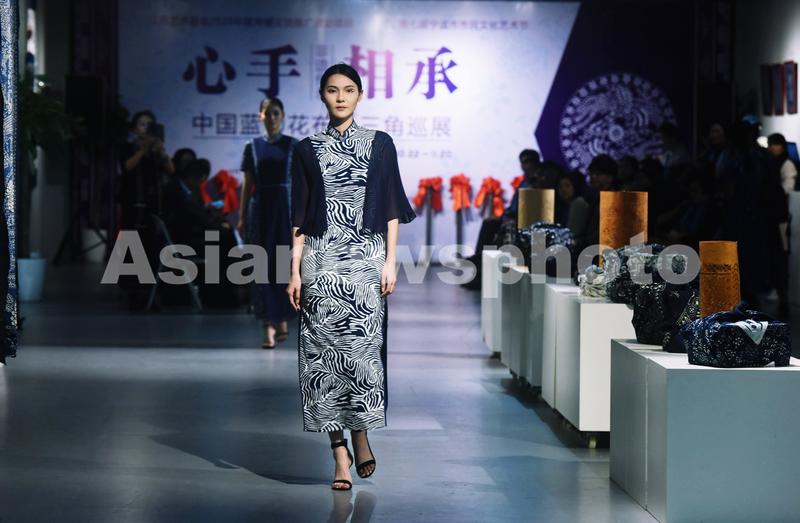 2020年10月22日,浙江纺织服装职业技术学院服装表演系的学生在展示由蓝印花布制作而成的时装。