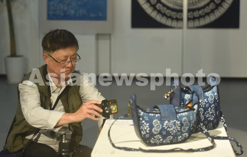 2020年10月22日,参观者在浙江纺织服装职业技术学院观看用蓝印花布制成的女式肩包。