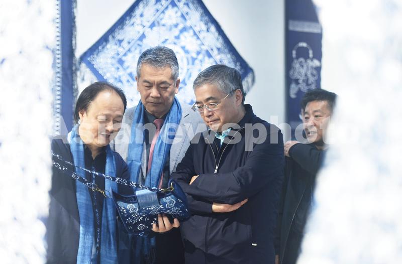 2020年10月22日,参观者在浙江纺织服装职业技术学院观看用蓝印花布制成的女式肩包。
