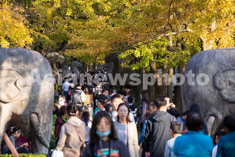 10月31日,游人在南京明孝陵景区石象路神道上观赏秋景。