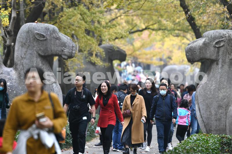 2020年11月1日,南京明孝陵石像路进入最佳秋色观赏季,吸引许多游人前来观赏。