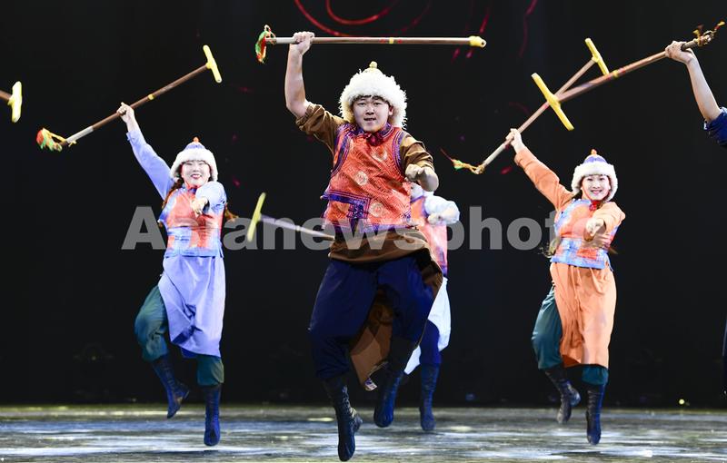 2020年11月1日,内蒙古巴彦淖尔市乌拉特后旗乌兰牧骑演员表演群舞《驼球赛》。