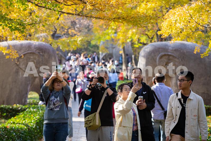 10月31日,游人在南京明孝陵景区石象路神道上观赏秋景。