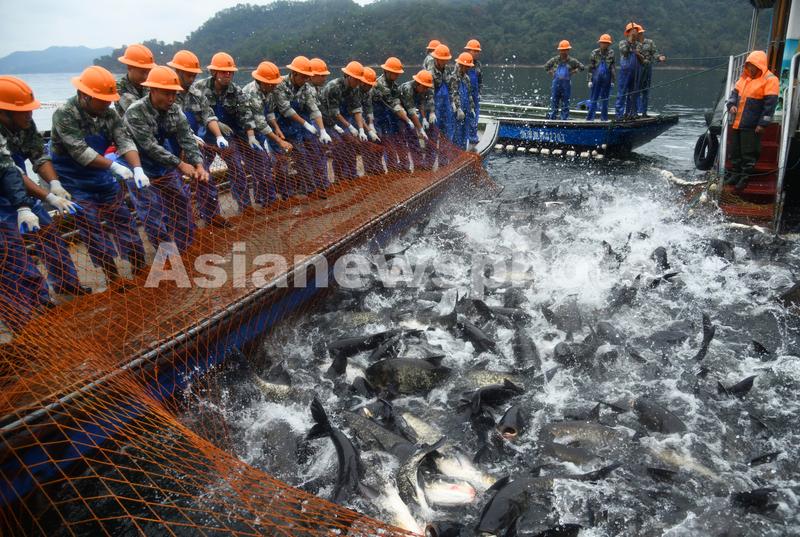 2020年11月1日,浙江省杭州市淳安县千岛湖许源大港渔场,上演秋季巨网捕鱼壮景,一网丰收了3万公斤有机鱼。巨网捕鱼是千岛湖有机鱼捕捞生产过程的最后一个环节,捕鱼过程通过拦网、刺网对鱼群的包围、截拦和驱赶,最后迫使被包围鱼群进入定置张网,从而达到集中捕鱼的一种捕捞方式。据了解,千岛湖一个月秋捕有机鱼已达100万公斤。