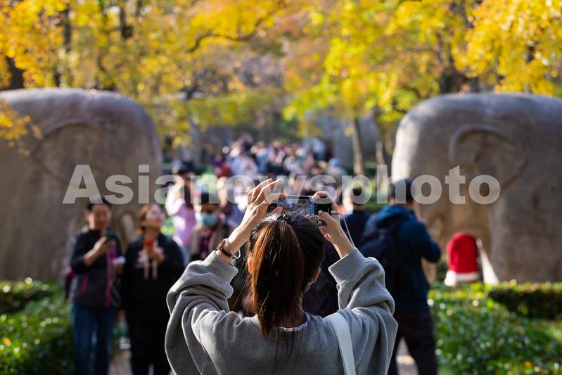 10月31日,游人在南京明孝陵景区石象路神道上拍照。
