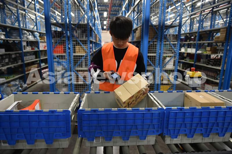 图片说明:2020年11月4日,工作人员在江苏省南京市苏宁雨花物流中心拣选包裹。