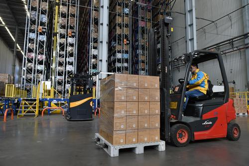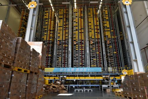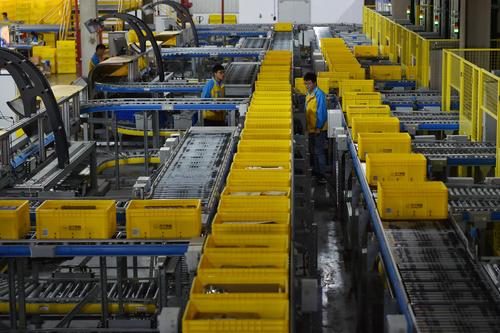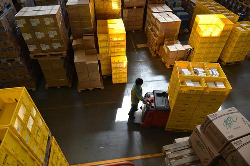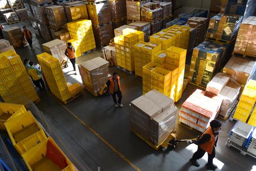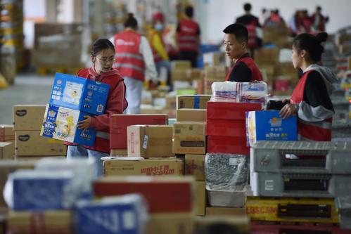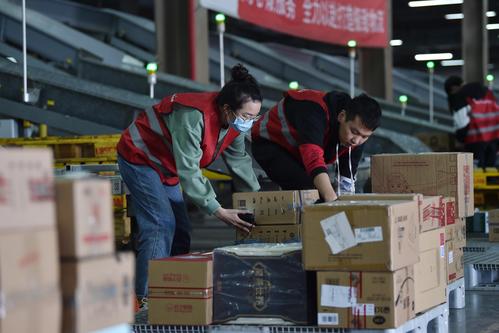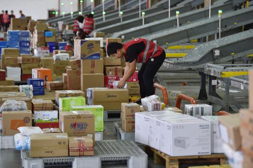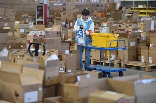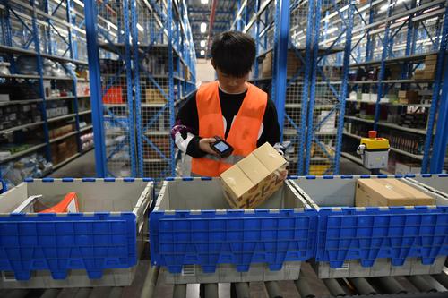 图片说明:2020年11月4日,工作人员在江苏省南京市苏宁雨花物流中心拣选包裹。