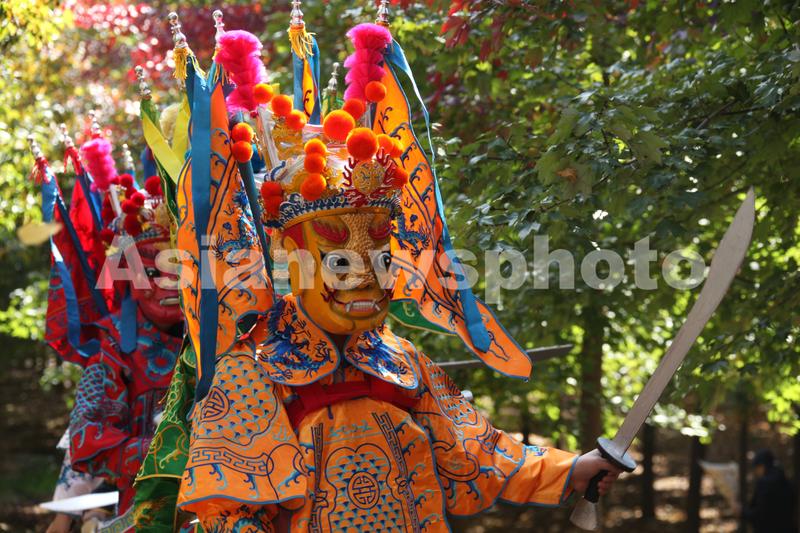 2020年10月31日,“跳五猖”队伍在南京高淳桠溪国际慢城的枫彩园里巡游。当日,在“2020年南京高淳桠溪国际慢城红枫节”开幕式上,“跳五猖”表演吸引众多游客的眼球。