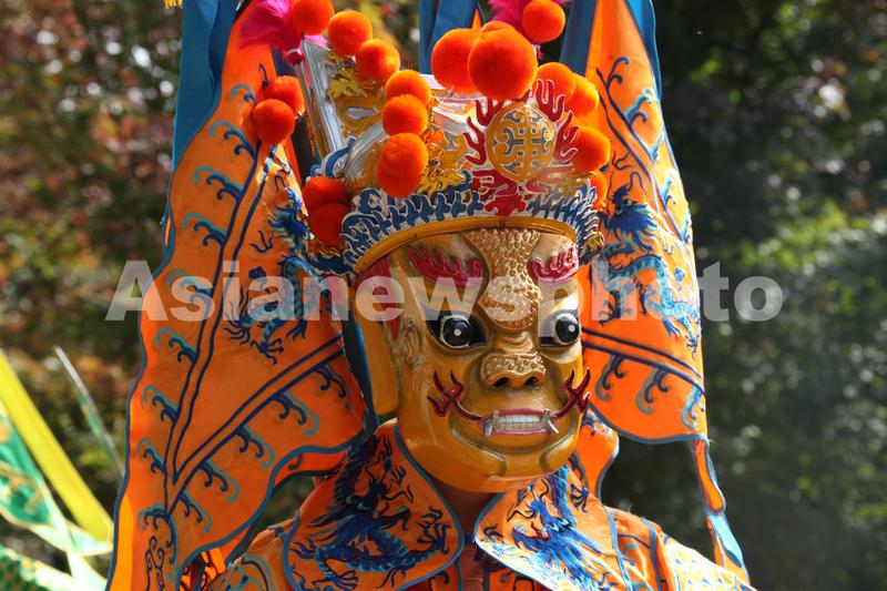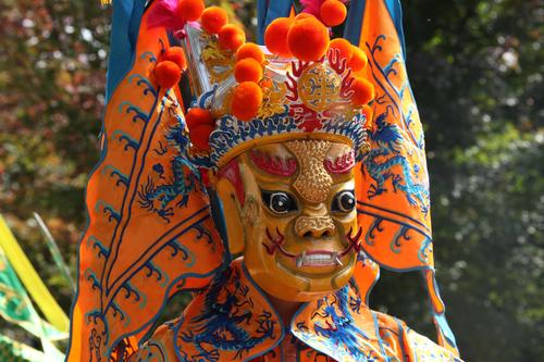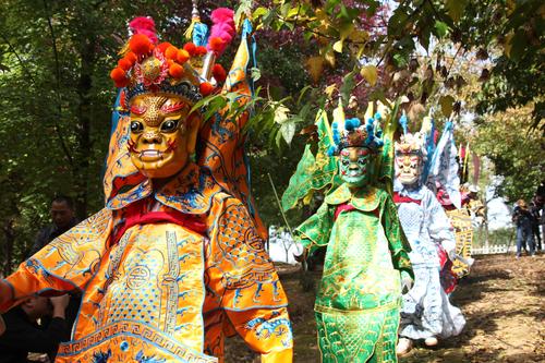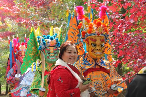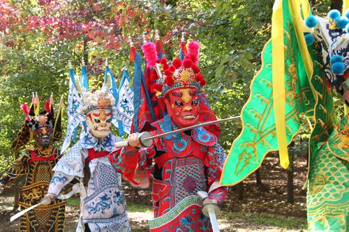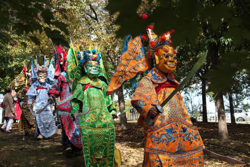 2020年10月31日,“跳五猖”队伍在南京高淳桠溪国际慢城的枫彩园里巡游。当日,在“2020年南京高淳桠溪国际慢城红枫节”开幕式上,“跳五猖”表演吸引众多游客的眼球。