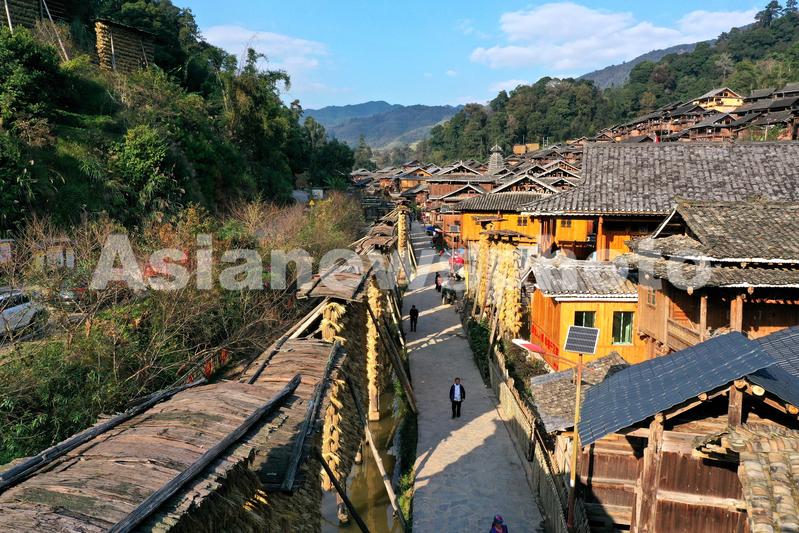 图片说明:2020年11月7日,贵州省从江县高增乡占里村,晾满糯稻谷的禾晾架与侗寨房屋相映成景(无人机照片)。