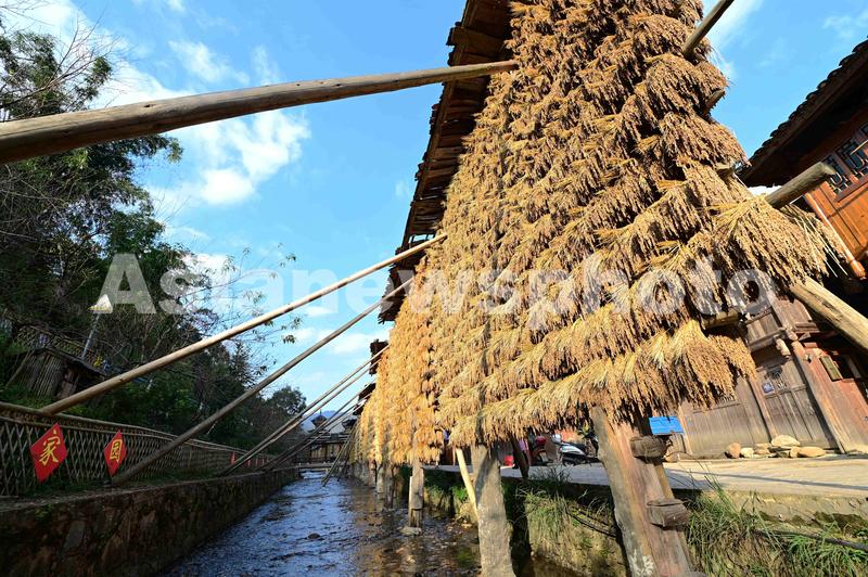 图片说明:2020年11月7日,在贵州省从江县高增乡占里村,侗族村民将收割的糯稻谷挂满禾晾架。