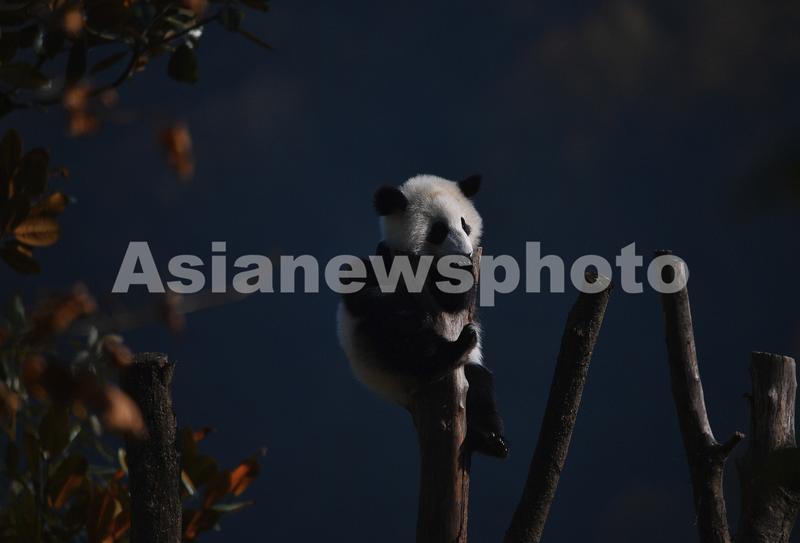 图片说明:11月11日,中国大熊猫保护研究中心卧龙神树坪基地,爬上树的大熊猫宝宝。