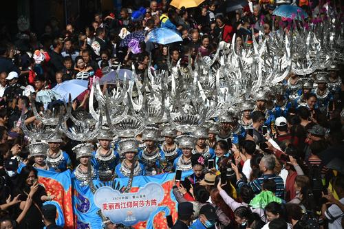 2020年11月19日,在贵州省雷山县,苗族同胞盛装巡游欢庆苗年。