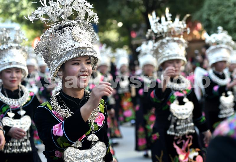 2020年11月19日,在贵州省雷山县,苗族同胞盛装巡游欢庆苗年。