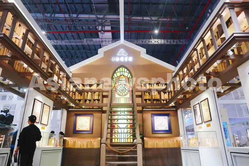 图片说明:2020年11月19日,上海,2020长三角国际文化产业博览会上,上海图书馆的展台搭建了一个复刻版的“徐家汇藏书楼”。