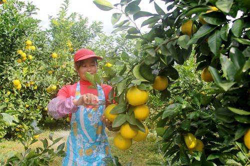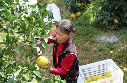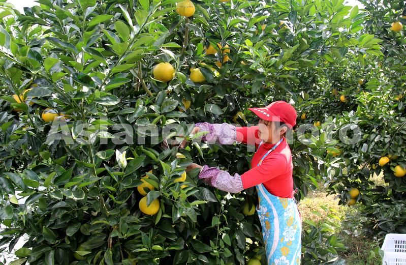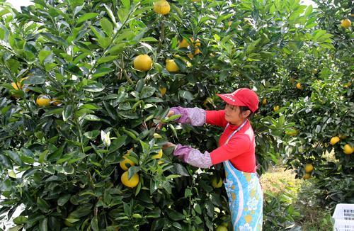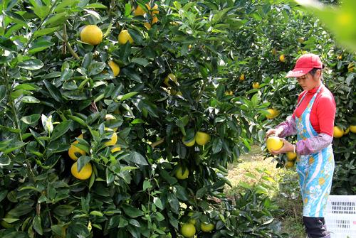 图片说明:2020年11月23日,江西省遂川县草林镇大坪村井冈果业种植基地果农在采摘丰收蜜柚。