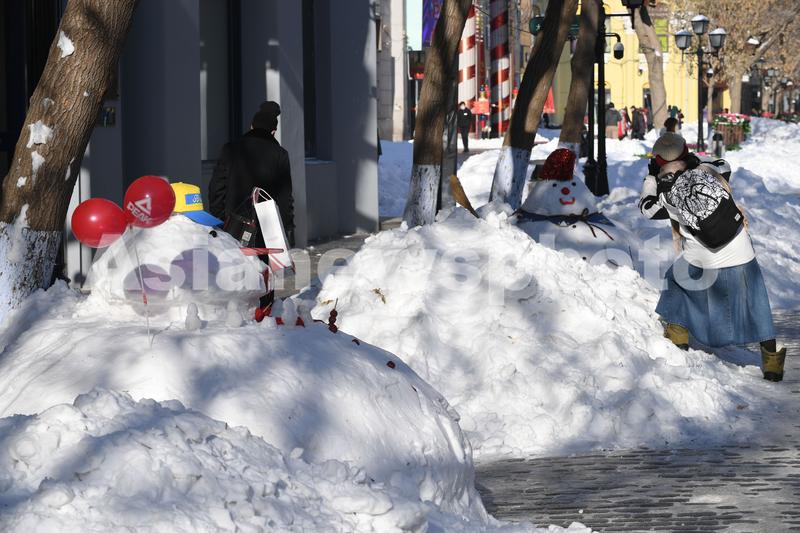 图片说明:11月22日,在哈尔滨百年老街中央大街上,积雪被堆成各式各样的雪人。