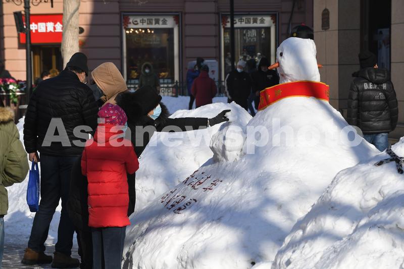 图片说明:11月22日,在哈尔滨百年老街中央大街上,积雪被堆成各式各样的雪人。