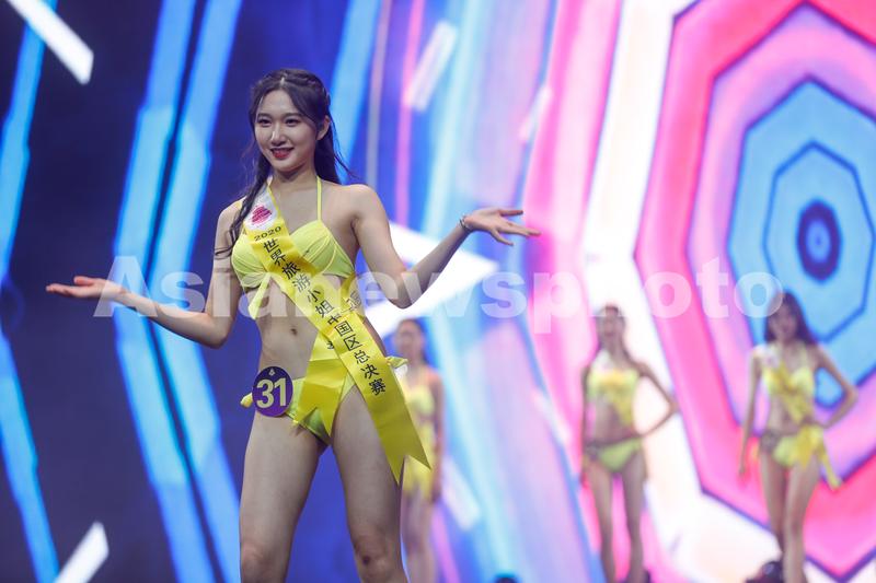 图片说明:2020年11月21日,参加2020世界旅游小姐中国年度冠军总决赛的佳丽进行泳装形体展示。